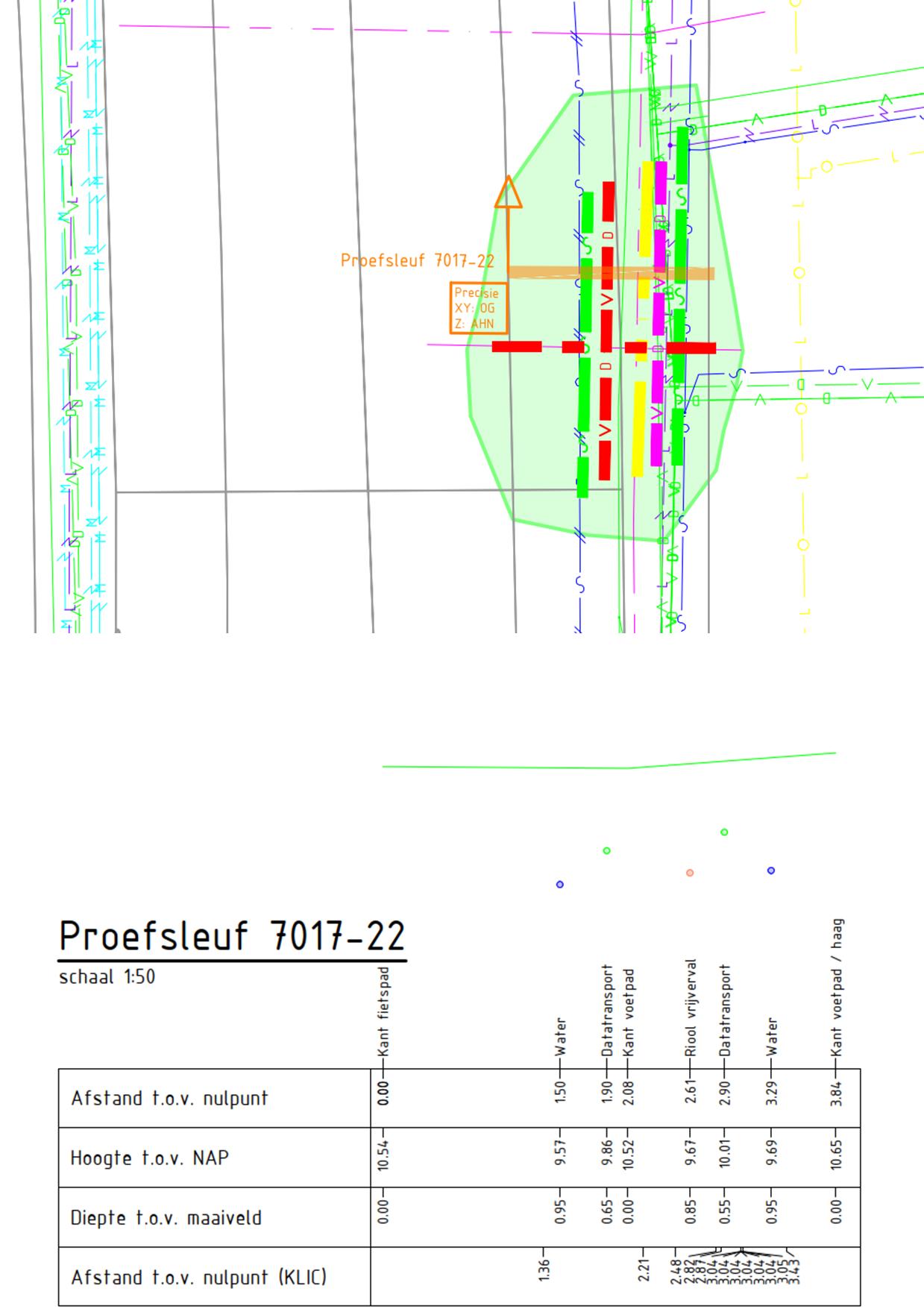 Van de ingewonnen data wordt een AutoCAD tekening gemaakt (2D en 3D) conform de NLCS, waarbij de gedetecteerde kabels en leidingen en andere objecten in RD-coördinaten (x, y en z) worden weergegeven. In het geval van digitale proefsleuven worden hierbij ook dwarsprofielen weergegeven en een vergelijking met de KLIC gemaakt.